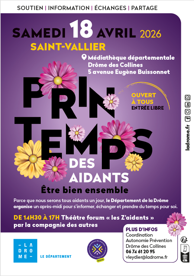 Une action printemps des aidants aura lieu à la médiathèque de St Vallier de 14h30 à 17H. Il s’agit d’un Théatre forum sur les Aidants présenté par la Compagnie des Autres.
