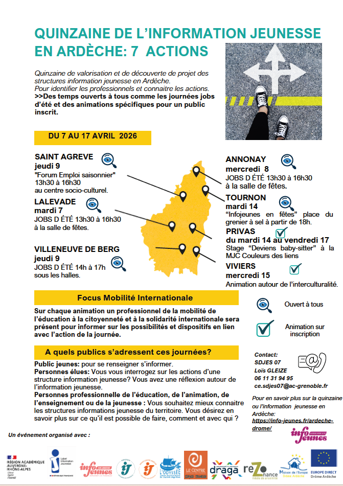 Le réseau des structures Information Jeunesse de l’Ardèche, avec le soutien du Service Départemental Jeunesse Engagement Sports (SDJES), organise une Quinzaine de l’Information Jeunesse comprenant un focus sur la mobilité internationale.